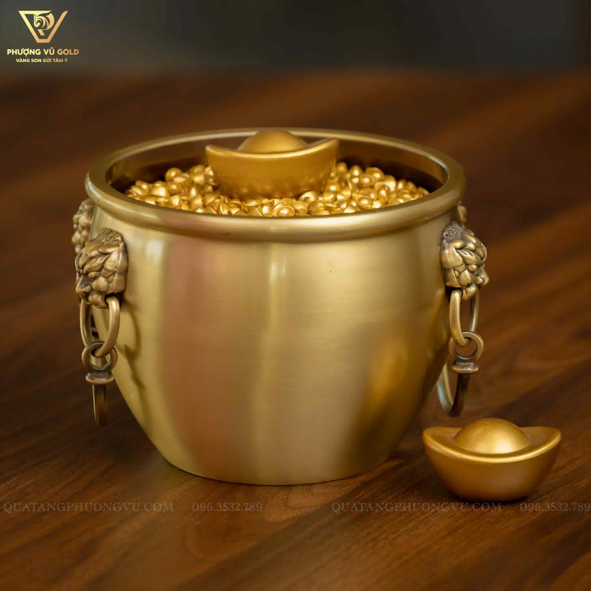 Hũ vàng thỏi với từng chi tiết dát vàng 24K sáng lấp lánh tượng trưng cho kho báu không vơi, phúc khí luôn đầy, giúp gia chủ hút vận tài, giữ vượng khí và chiêu tài lộc quanh năm.