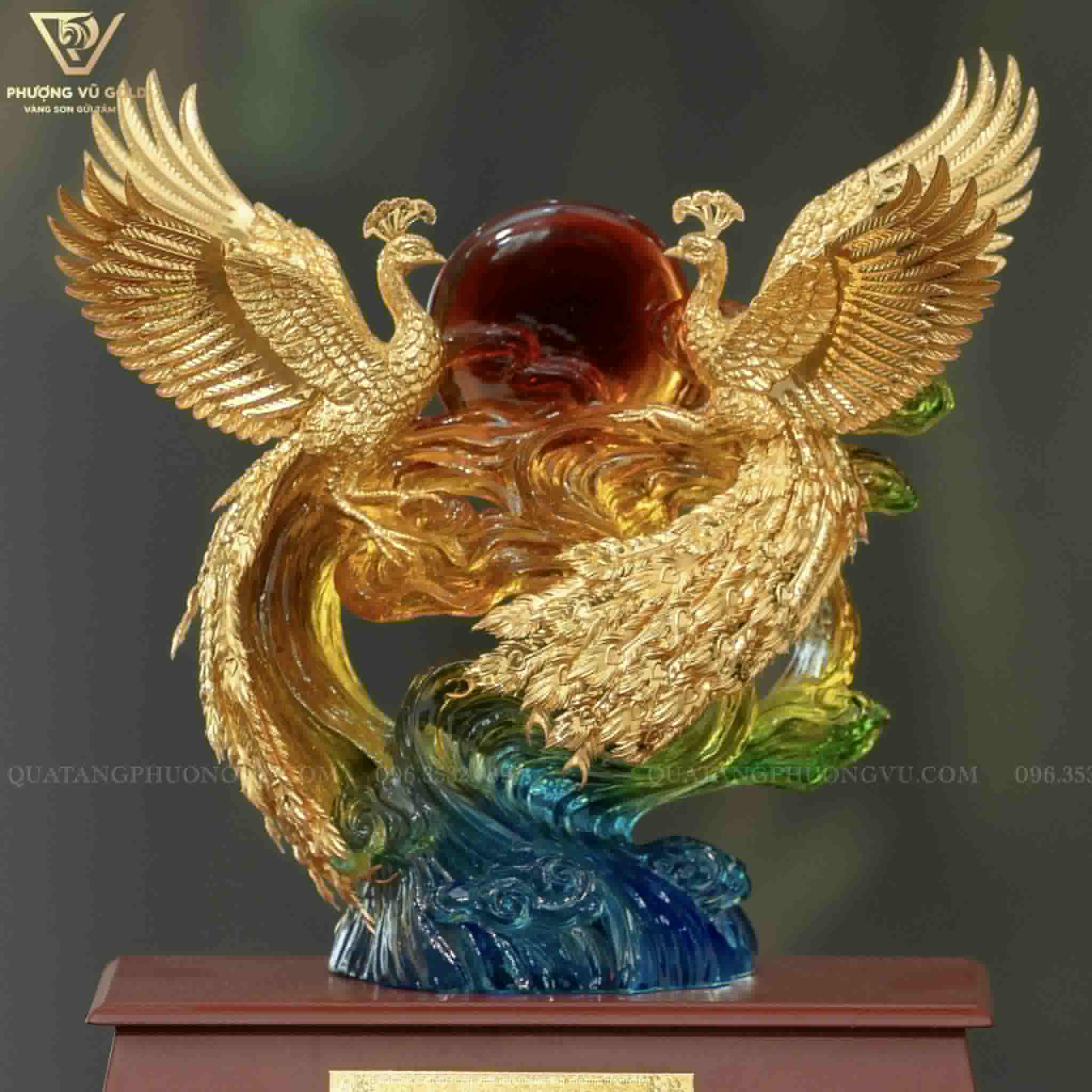 • Đôi chim phượng hoàng: phủ vàng 24K sáng ánh kim, thể hiện sự quyền quý và tinh xảo đến từng chi tiết lông vũ.